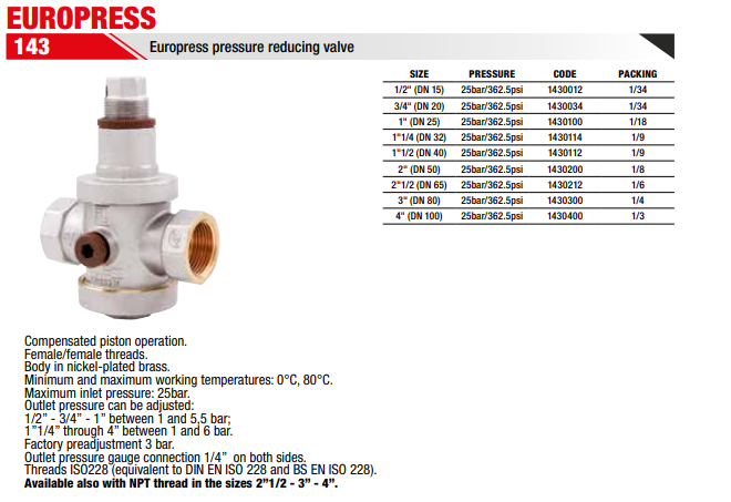 Van giảm áp (Pressure Reducing Valve) là thiết bị dùng để giảm và duy trì áp suất nước hoặc chất lỏng ở mức an toàn trong hệ thống ống dẫn. Van hoạt động tự động, điều chỉnh áp lực đầu ra thấp hơn và ổn định hơn so với áp lực đầu vào.